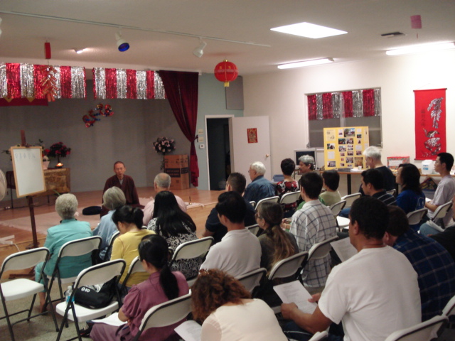 The attendees in place, seated variously on chairs and on the carpeted floor, with cushions, Venerable Jian Hu first gave a brief introduction to the essentials of meditation, it being a way to tame the mind, distracted as it is by our endless search for happiness, not realizing that our preoccupation is actually a delusional facade and is the very source of our unhappiness.